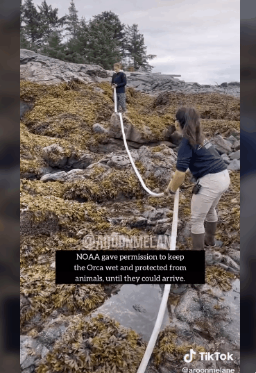 그리고 얼마 지나지 않아 국립해양대기청(NOAA) 소속 구조대가 출동, 기계를 이용해 범고래에게 바닷물을 쉴 새 없이 분사하기 시작했다. 이러한 과정은 바위틈에 좌초된 고래가 움직이지 못하는 사이, 이를 먹잇감으로 인식한 새들이 다가와 공격하거나 쪼아먹는 일을 미연에 방지하기 위해서였다.