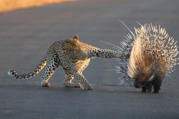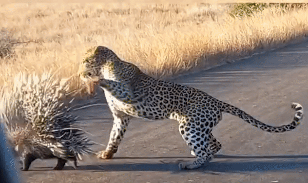 최근 남아프리카공화국 크루거국립공원에서 표범 한 마리가 심하게 굶주렸는지 커다란 가시가 주렁주렁 매달린 산미치광이를 쫓기 시작했다. 하지만 이는 나중에 후회할 만한 결정이었던 것 같다.