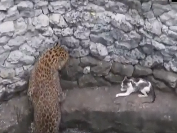 ‘나시크의 우물에 빠져 얼굴을 맞대고 있는 표범과 고양이’라는 설명이 곁들여진 해당 영상에는 우물안에 있는 폭 30㎝의 난간에서 표범이 고양이를 위협하는 모습이 담겼다.