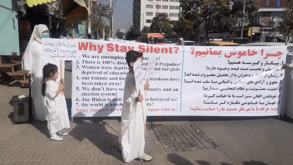 현지 대학 교수로만 알려진 남성은 이날 아침 아내와 어린 자녀를 이끌고 거리 시위에 나섰다. 하얀 수의를 입은 이들 가족 손에는 “왜 침묵하는가”라는 내용의 현수막과 피켓이 들려 있었다. 톨로뉴스는 이들이 최악의 경제과 여성의 교육 및 취업 기회 박탈, 아프가니스탄 문제에 대한 세계의 침묵에 대해 꼬집었다고 전했다.