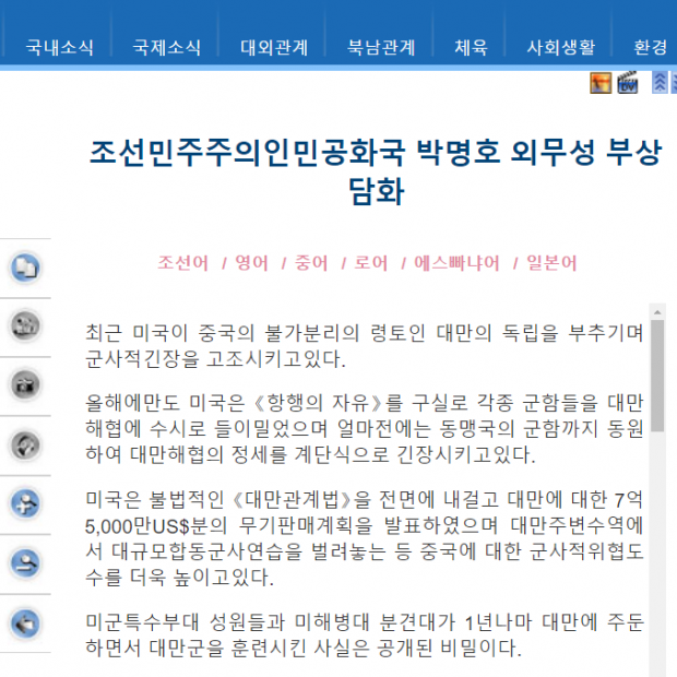 당시 박 외무성 부상이 발언한 “미국이 겉으로는 하나의 중국 정책을 견지한다고 하지만 실제로는 대만을 반중국 압박 도구로, 유사시 중국을 제압하기 위한 전초기지로 써먹고 있다는 것을 실증해주고 있다”는 부문을 거듭 강조해 보도하는 분위기가 연출됐다.