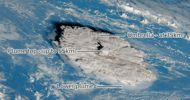 22일(현지시간) 미국 민간 위성사진업체 맥사테크놀로지는 통가 화산의 분화 전과 후를 보여주는 위성 사진을 언론에 공개했다. 불과 이틀 전인 지난 20일 위성으로 촬영된 사진을 보면 하파이 군도의 노무카 섬은 검붉은 황토색으로 변했으며 중앙의 큰 호수는 마치 눈이 내린듯 보인다. 이는 섬 전체를 덮친 화산재와 쓰나미의 흔적으로 보인다.