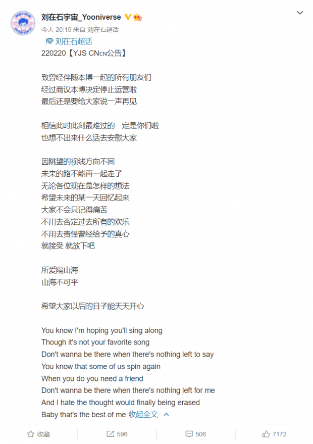 중국 현지 시각으로 20일 저녁 8시 15분 유재석 팬클럽인 ‘유재석유니버스(刘在石宇宙)’에서는 장문의 운영 중단 선언문을 발표했다. “운영진과 논의한 결과 오랫동안 함께해 온 이 공간 운영을 중단한다”라며 “마지막으로 팬 여러분들께 인사를 남긴다”라고 쓰여있다. 그러면서 “이 순간 가장 힘든 사람은 우리 팬들일 것”이라면서 “어떤 말로도 위로할 수 없다”라며 “그래도 과거 그를 사랑하고 즐거웠던 마음까지는 자책하지 말아라”라고 말했다.
