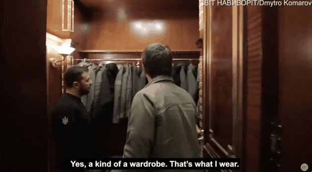녹색과 검은색의 옷으로 가득 채워진 옷장과 관련해서는 “전쟁 이후 군용 복장으로 갈아입는 순간, 인생의 모든 것이 바뀌었다. 그리고 이전으로 돌아가는 것은 불가능했다”면서 “전쟁이 일어나기 전에 마지막으로 입었던 정장은 ‘상징’으로 간직하고 있다”고 설명했다.