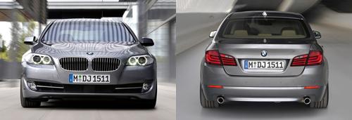 신형 5시리즈는 7시리즈의 우아한 차체 라인과 3시리즈의 역동성을 적절히 조합한 모습이다. 특히, 더욱 커진 라디에이터 그릴을 비롯해 전조등, 후미등, 범퍼 디자인이 7시리즈와 닮았다.