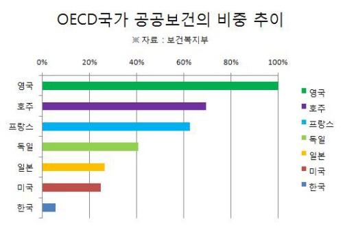 보건복지부가 제출한 공공보건의료 비중 추이 자료에 따르면 한국의 공공의료 비중은 지난해 말 현재 기관수 기준 5.8%, 병상 수 기준으로 10.0%로 나타났다. 이는 병상 수 기준, 영국 100%, 호주 69.5%, 프랑스 62.5%, 일본 26.4%에 비하면 터무니 없이 낮은 수치다.