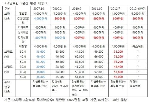 위의 표처럼 A보험사의 A 암 보험 상품은 5년 간 크게 4번에 걸쳐 내용이 바뀌었다. 손해율이 높아져 위험률 상승으로 보험료가 인상된 경우도 3번이 있었으며, 보장금액도 일부 축소가 있었다.