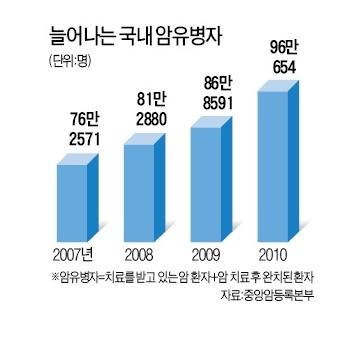통계청 자료에 따르면 2001년 암 사망자는 인구 10만 명당 1백22.9명에서 2010년 1백42.6명으로 증가했다. 2010년 국내 총 사망자에서 암으로 사망하는 비율도 28.2%로, 1983년 11.3%에 비해 높아진 것으로 나타났다.