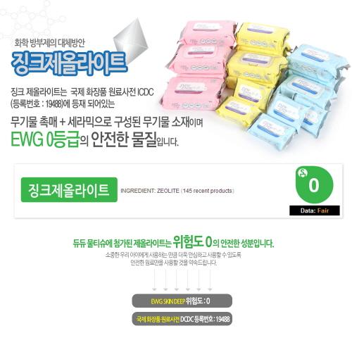 듀듀물티슈는 오직 정제수, 부직포, 듀듀 징크제올라이트로만 이루어져 있는 무방부제 베이비 물티슈다. 징크제올라이트는 국제 화장품 원료사전집에 등재된 안전성이 입증된 무기물질로, 항균(항곰팡이, 항박테리아, 항바이러스) 효과 및 탈취 효과가 뛰어난 데다가 EWG SKIN DEEP 위험도 0을 자랑하는 안전한 물질이다.