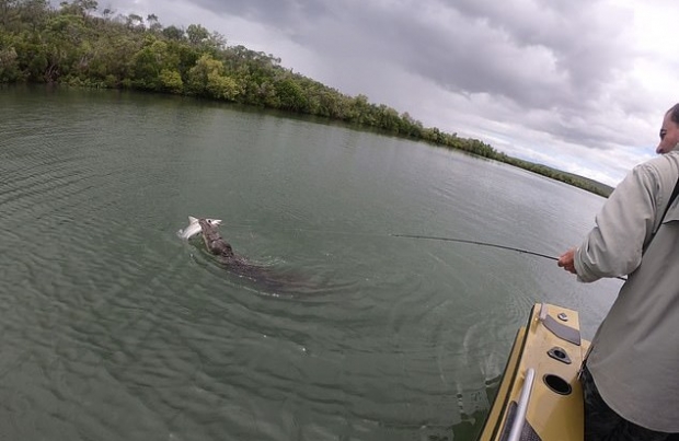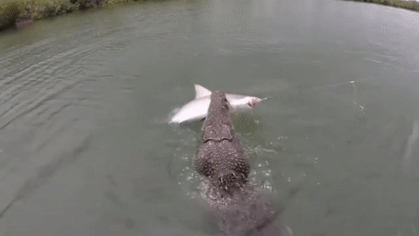 [여기는 호주] 낚시꾼이 힘들게 잡은 상어 덥석 물어 채가는 바다악어 (영상)