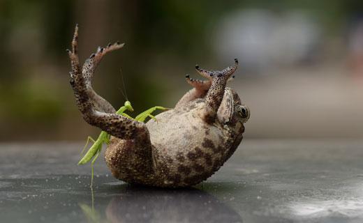 사진 속 사마귀는 진짜로 두꺼비 배를 자신의 앞발을 사용해 살살 간지럽히는 듯하며, 두꺼비는 매우 좋아 다리를 쭉 편 채 고스란히 누운 듯 보인다.