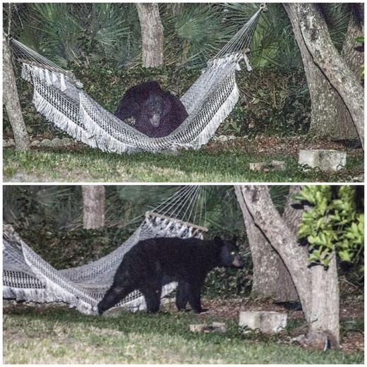 보도에 따르면, 이 야생 흑곰이 처음 동네에 나타난 것은 지난 28일로 당시 밤늦게 동네 쓰레기통을 뒤지는 등 마을 일대를 공포 분위기로 몰고 간 바 있다. 그리고 이 흑곰이 다시 모습을 드러낸 것은 다음 날 오후 7시 45분 경 인데, 이번에는 다소 황당한 모습이었다. 한 가정집 뒷마당에 설치된 그물 침대에서 넉살 좋게 잠을 자다 발각된 것.