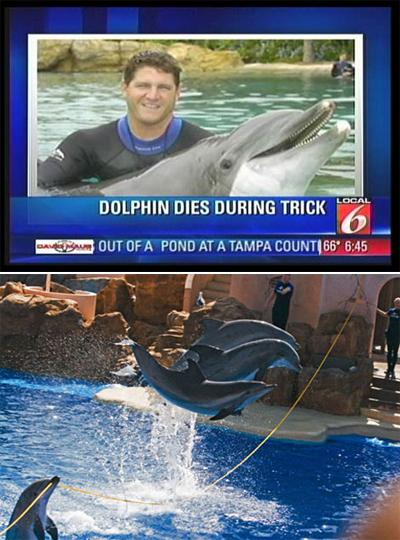 미국 플로리다주(州)의 올란도지역신문 로컬6(local6.com)뉴스는 “올란도의 테마파크 디스커버리 코브(Discovery Cove)에서 공연 연습 중이었던 돌고래 2마리가 서로 머리를 부딪혀 1마리가 즉사했다.”고 지난 28일(현지시간) 보도했다.