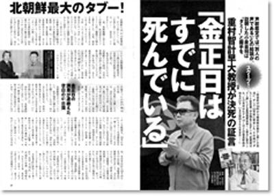 일본 유력지 마이니치신문의 기자로 일했던 시게무라 교수는 지난 달 19일 발간한 이 책에서 “김정일은 2000년 지병이었던 당뇨병이 악화되어 휠체어생활을 했고 2003년에 사망했다.”며 “지난 2003년 9월 10일부터 42일간 김정일의 동정이 사라졌을 때가 사망시점 일 것”이라고 주장했다.