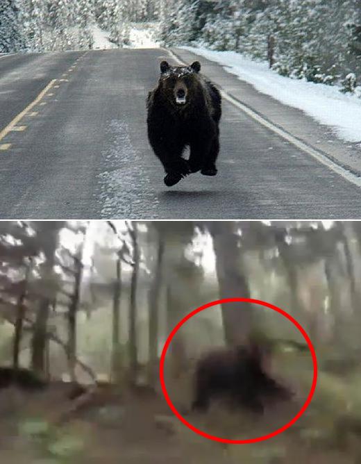 영상 22초쯤, 그 남성은 우측에서 무언가 흐릿한 검은색 물체를 목격한다. 그는 순간적으로 욕설 섞은 감탄사를 내뱄으며 이전보다 더욱 빨리 도망가듯 뛰어간다. 숨소리도 점차 거칠어지고 자꾸 뒤를 힐끗 쳐다보는데 정황을 미뤄볼 때 그 물체가 곰이었음을 알 수 있다.