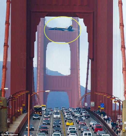 최근 지역 거주민인 아마추어 사진가 리치 쉘튼(55)은 지난 9일(현지시간) 금문교 위에서 촬영한 사진들을 언론에 공개했다. 사진 속 전투기는 미 해군 및 해병대의 주력 전투기 F/A-18 호넷. 다리를 건너는 차량과 사람들로 북적이는 금문교 위를 최신예 전투기가 지나간 것은 당시 '에어쇼' 중이었기 때문이다.