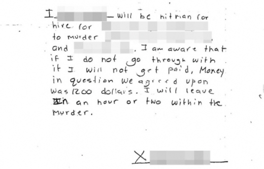 이 소년은 자신이 고용한 친구와 계약을 맺은 내용을 담은 노트에서 자신의 가족을 살해하는 대가로 1,200달러를 지급하겠다는 내용까지 밝혔다. 그는 "고용한 친구가 집에 침입해 총으로 가족을 살해한 다음 자신은 다른 집으로 뛰어가 집에 강도가 들었다고 거짓 신고할 것"이라고 구체적으로 계회까지 세웠던 것으로 드러났다.