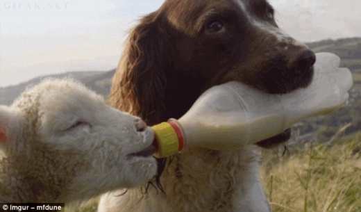 우유병을 입에 물고 새끼 양에게 젖을 먹이는 대형견의 모습 역시 따뜻한 모성애를 연상케 하는 팀워크의 모습이다.