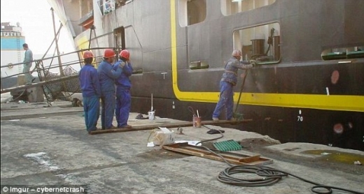 진짜 팀워크가 필요한 공사현장을 담은 모습도 있다. 노동자 한 명이 아래에 텅 빈 공간이 있는 곳에 널빤지를 대고 작업을 하고 있고, 나머지 노동자 3명은 반대쪽에서 널빤지가 기울지 않게 나란히 서 있다.