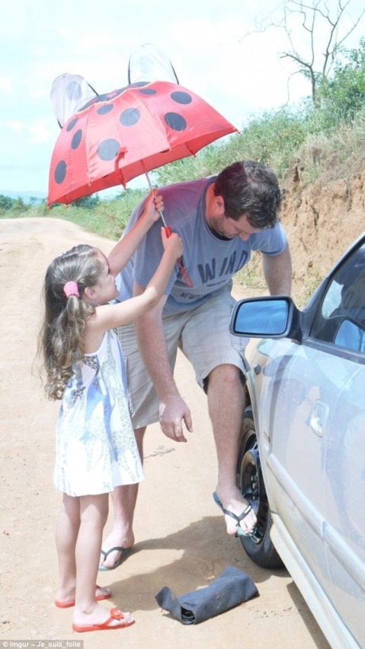 땡볕에서 타이어를 고치는 아버지와 딸의 협동심도 눈길을 끈다. 열 살 내외로 보이는 어린 딸이 차에 바짝 붙어 타이어를 손보고 있는 아버지 옆에 서서 자신의 작은 우산으로 아버지에게 그늘을 만들어 주는 모습이 훈훈한 감동을 준다.