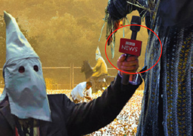 우허치린의 이번 삽화에는 이른바 ‘KKK단’으로 불리는 백인 우월주의 단체 회원들이 착용하는 것 같은 흰색 두건을 쓴 방송기자와 카메라맨이 흑인 노예들이 착취를 당하고 있는 면화밭을 배경으로 허수아비를 인터뷰하는 모습이 담겼다.