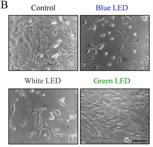그다음으로 백색 불빛이 70%, 녹색 불빛을 받은 세포는 별다른 변화가 없는 것으로 나타났다.