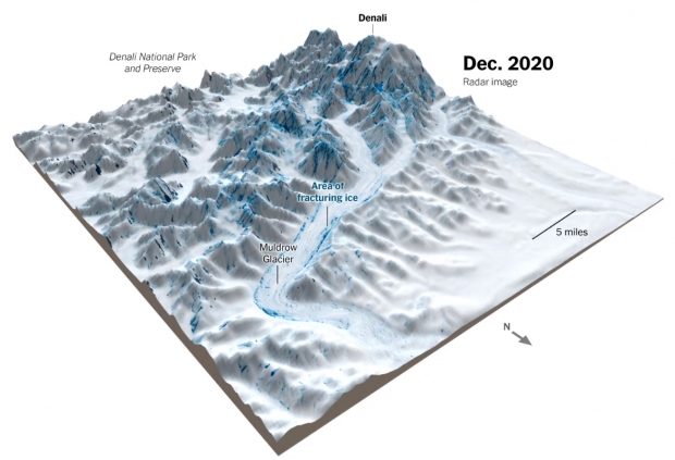 13일(현지시간) 뉴욕타임스 등 외신에 따르면, 빙하학자들은 알래스카주 디날리산 북쪽에 있는 길이 약 63㎞의 멀드로 빙하가 이동하는 속도가 하루 30㎝ 미만에서 27m 이상으로 100배가량 급증한 현상을 확인했다.