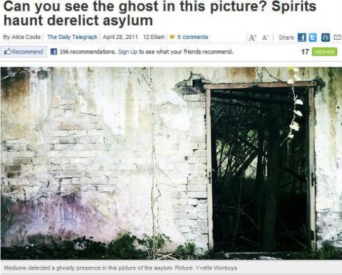 사진의 제목은 ‘유령’. 사진작가 이벳 얼보이스의 작품이다. 문제의 사진은 시드니의 유명한 정신병원의 출입구를 찍은 사진이다. 뉴사우스웨일즈 주 글래스빌에 위치한 이 정신병원은 지금 부터 170년 전인 1838년에 개원했고 1997년에 문을 닫았다. 이 병원은 ‘타반 그릭 정신병자 수용소’로 알려져 있다.