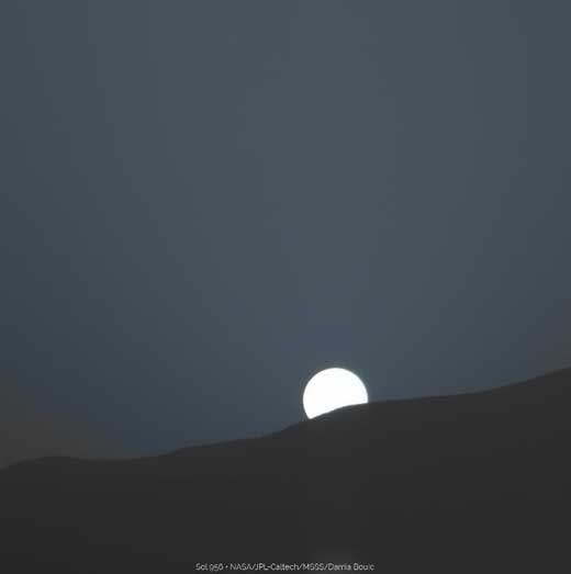 이 사진은 지난달 15일 화성을 탐사 중인 미 항공우주국(NASA)의 큐리오시티가 956솔(SOL·화성의 하루 단위로 1솔은 24시간 37분 23초로 지구보다 조금 더 길다)째 촬영한 장면을 디지털 보정한 것이다. 공개된 사진에서도 드러나듯 지평선 밑으로 서서히 사라지는 태양의 모습은 색깔 이외에는 지구의 석양과 큰 차이점은 없다.