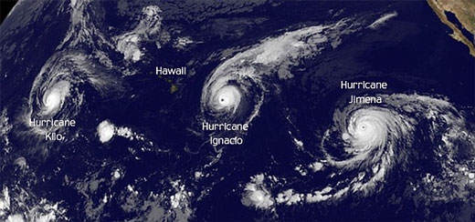 지난 30일(현지시간) 미 국립해양대기청(NOAA)은 기상 관측위성으로 포착한 3개의 허리케인 이미지를 공개했다. 현재 태평양을 중심으로 세력을 확산 중인 이 허리케인의 이름은 각각 킬로(Kilo), 이냐시오(Ignacio), 히메나(Jimena)로 모두 ‘슈퍼 태풍’ 급에 속한다.